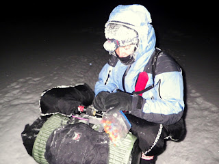Battiamo la neve per ricavarci uno spazio sufficiente per posare i nostri sacco a peli e ci distendiamo....la mia giacca è completamente ghiacciata anche all'interno...che brutta sensazione ....stiamo per prendere sonno quando vediamo avanzare verso di noi un fascio di luce che illumina a giorno lo spazio circostante.....ma chi è???????????sono i trail brakers della Great Sled Dog Race!!!!!!stanno tracciando la pista per la gara che dunque passerà di qui fra qualche ora!!!wow!!!!che fortuna !!!